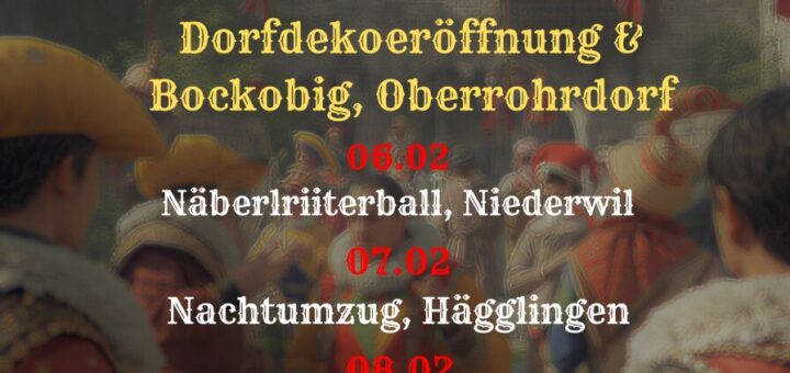 Hoi Zäme! Infos zu eusere Tour sind etzt verfüegbar. Mer freued eus uf euch a jegliche Aläss. Ganz bsonders natürlich a eusne eigne in Oberrohrdorf: 31.01.2026 Dorfdeko-Apéro und Bockobig14.02.2025 Hinterbächliball16.02.2025 Lüpfige Mentig